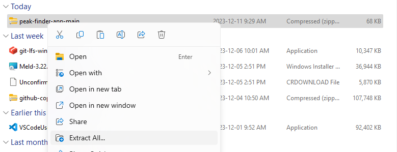The same batch file can be used to install or update peak-finder. A conda environment named peak-finder will be created to prevent conflicts with other software that may rely on Python.
