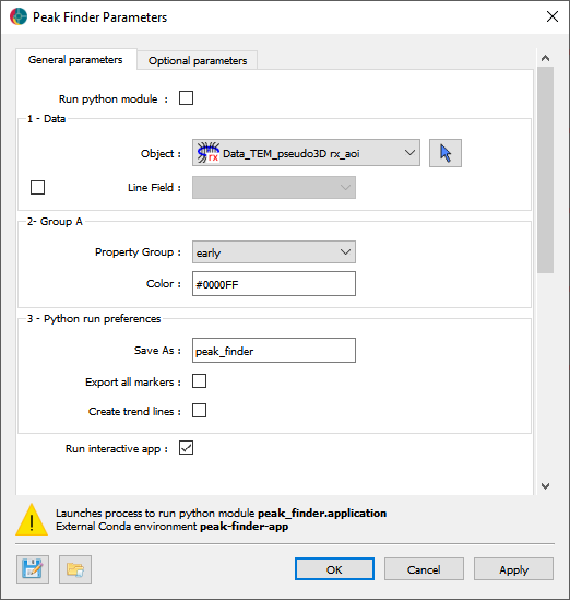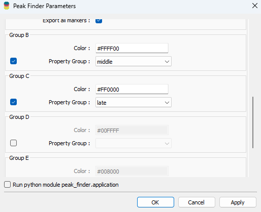 Note that the group parameters have no equivalent in the interactive application, and must be set in the optional parameters tab. If a user wishes to find peaks in more than one group of time channels, say, they must add the groups here.